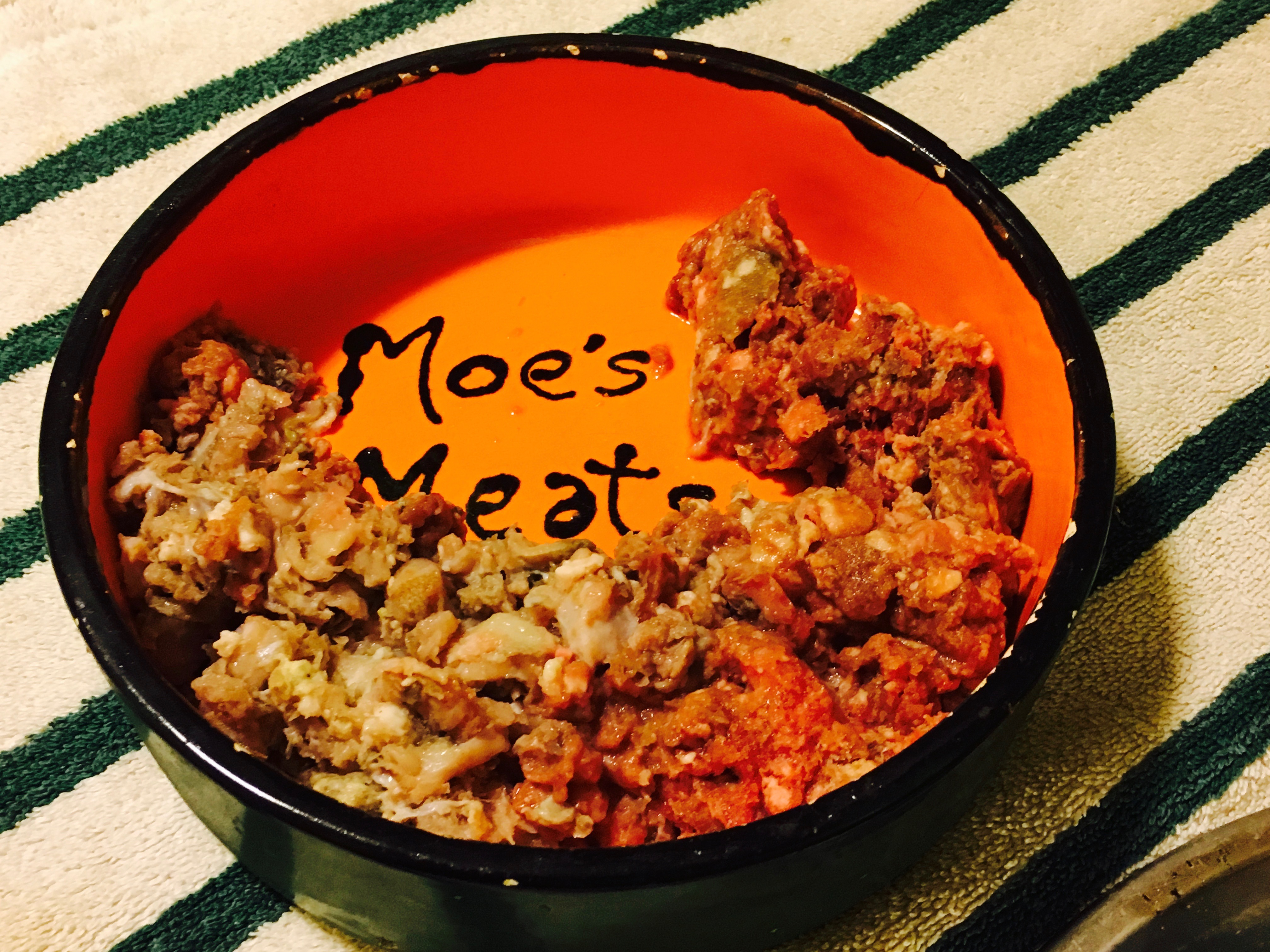 3. Dainty dinner at Grandma’s style (Moe’s favorite): Separate your beef and heart and tripe on opposite sides of the bowl and let the dog do his work.