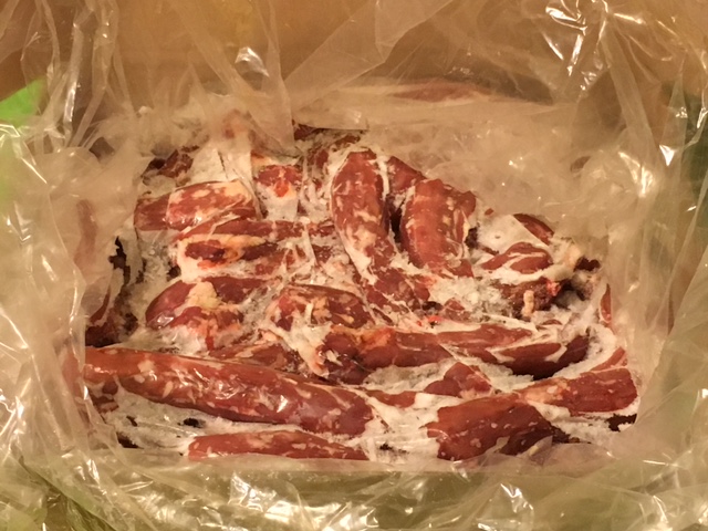 Moe’s duck necks are sold by the 18-pound case (frozen and easy to break apart) or this case can be broken up into gallon freezer bags.